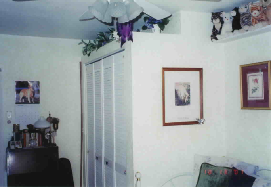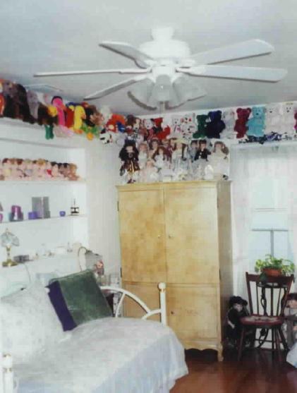 Here is the same room after painting and installation of shelving and curtains. The medium green over pale green ragging on the walls results in a soft, relaxing color, and complements the comforter on the new day-bed. When not in use, the owner's stereo and bedroom TV are hidden inside an older curved front armoire. The concrete floor was covered in new oak hardwood flooring. Additional shelving near the ceiling, painted in the same pale green used on the walls, was added to hold an extensive stuffed animal collection. A ceiling fan with appropriate lighting helps complete the look. Another view of the room is below, looking back the other direction. Rope lighting was laid on the top of the closet behind the silk flowers to provide accent lighting.