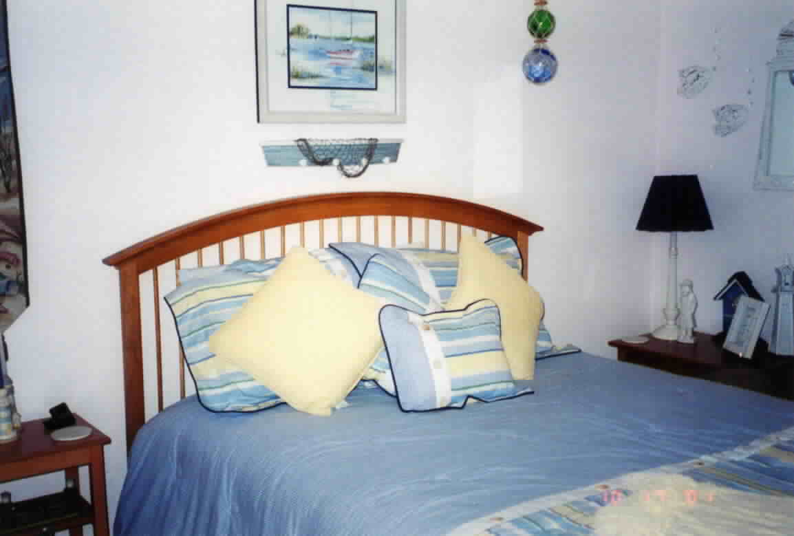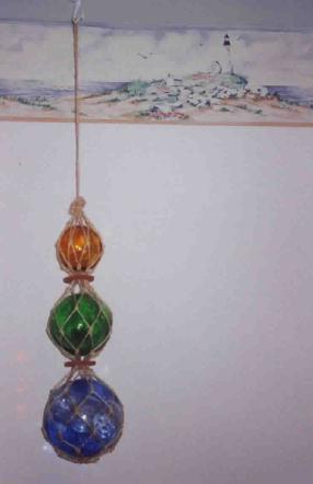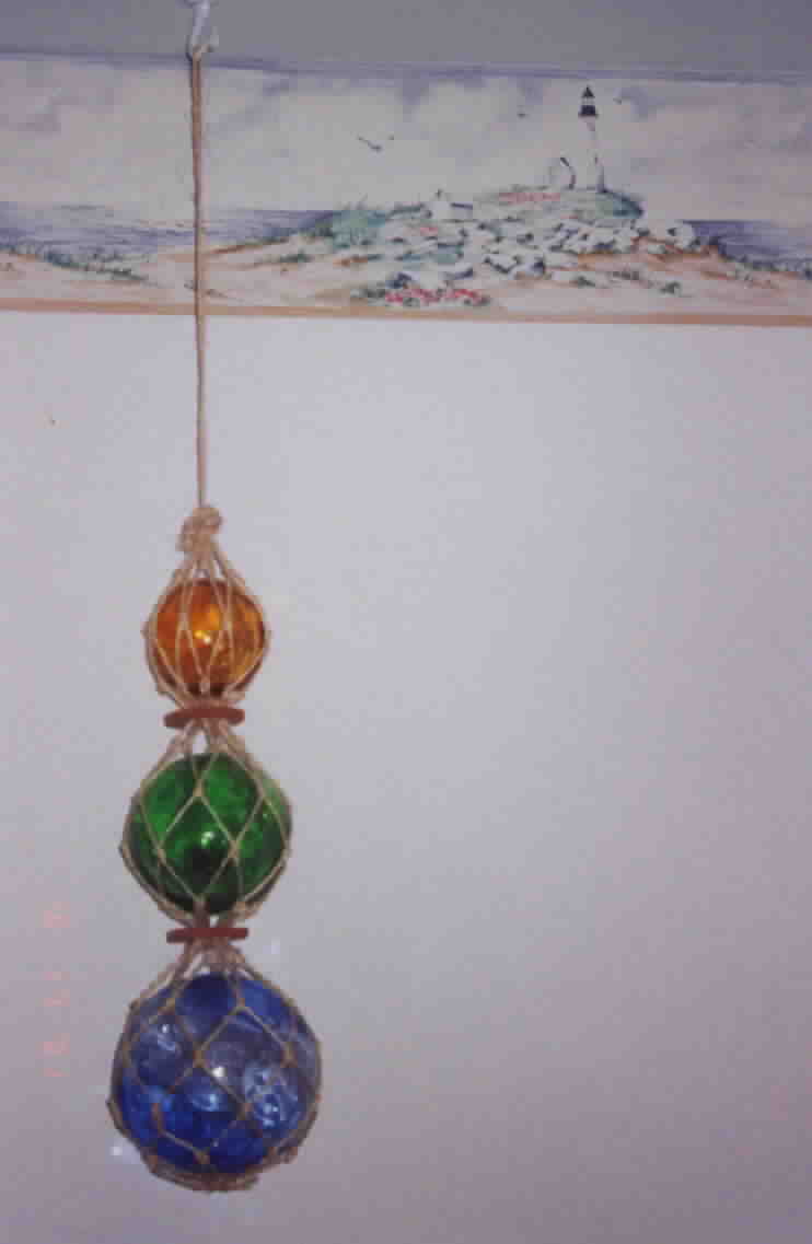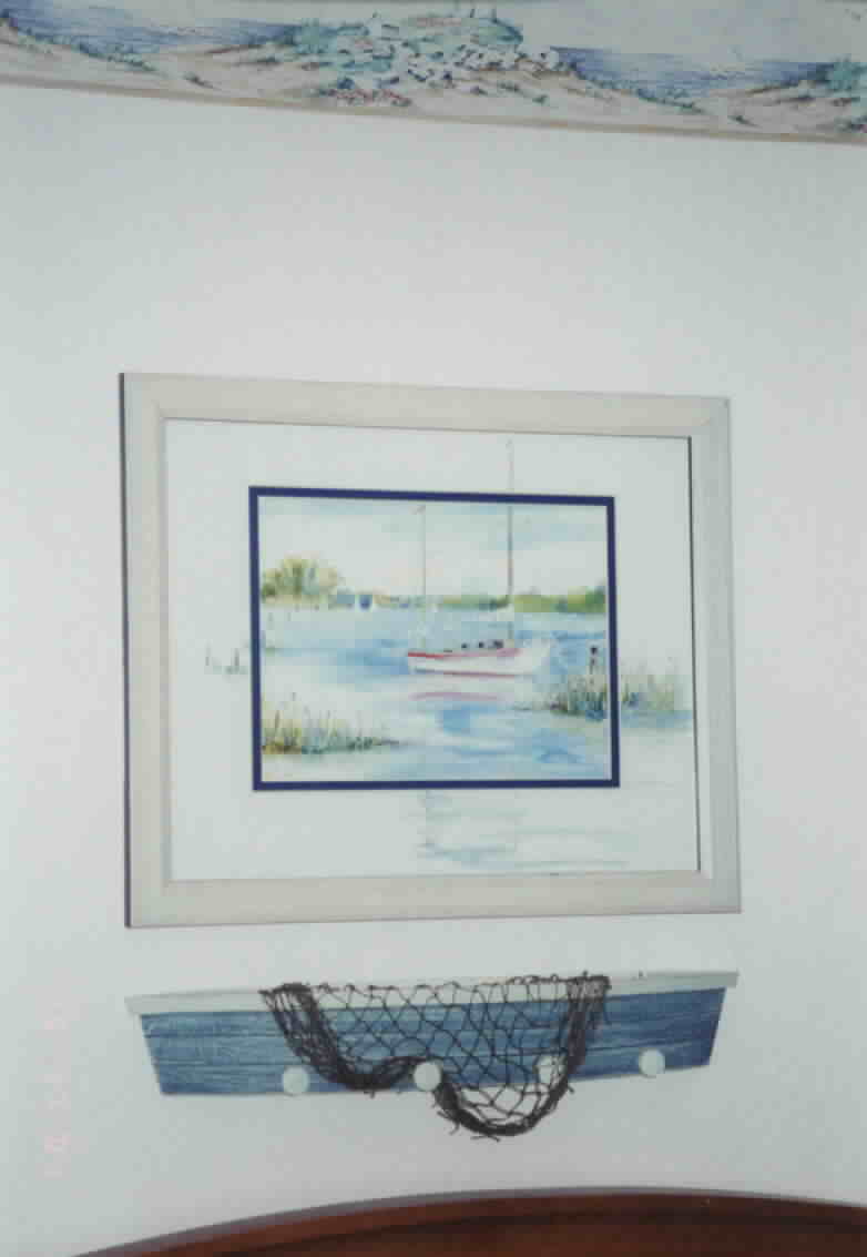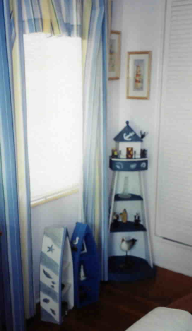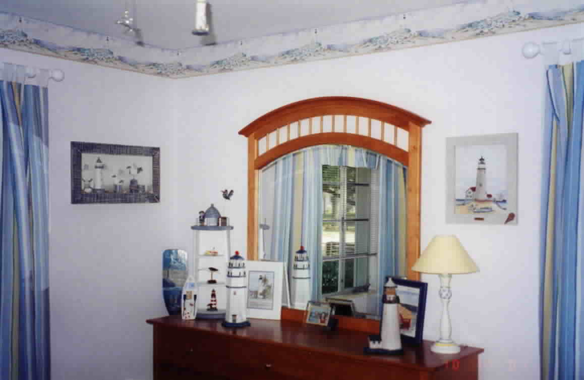The next five pictures are from a bedroom make-over in a 50's bungalow to reflect a nautical theme, specifically lighthouses. The room was already painted in flat white, which was retained to complement the sea-side feeling of the accessories. New draperies in a striped print pick up the colors in the border print as well as the paintings and lighthouse vignettes. The natural wood dresser and bed complete the nautical feel.