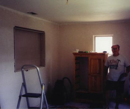 This is a "before" picture of a bedroom addition on a 60's home. Room was added to rear of house, and previous outside window was closed off between spaces. Rather than blocking off this side, it was decided to make the area into inset shelving. Walls will be painted with a ragging technique, stenciling will be added, and curtains installed over windows.