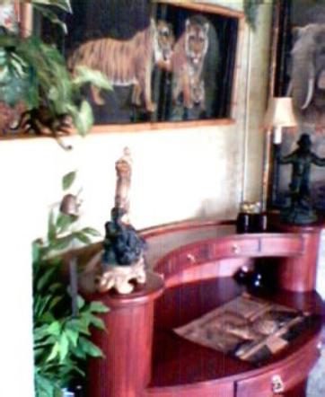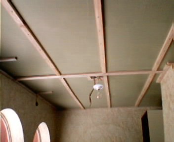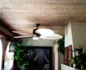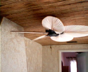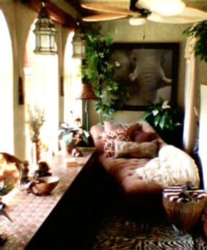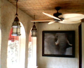 The photos following show several steps in the process, which included applying a beige and metallic gold faux finish (sponged), covering the ceiling in bamboo, installing lighting and an appropriate ceiling fan, and adding accessories.