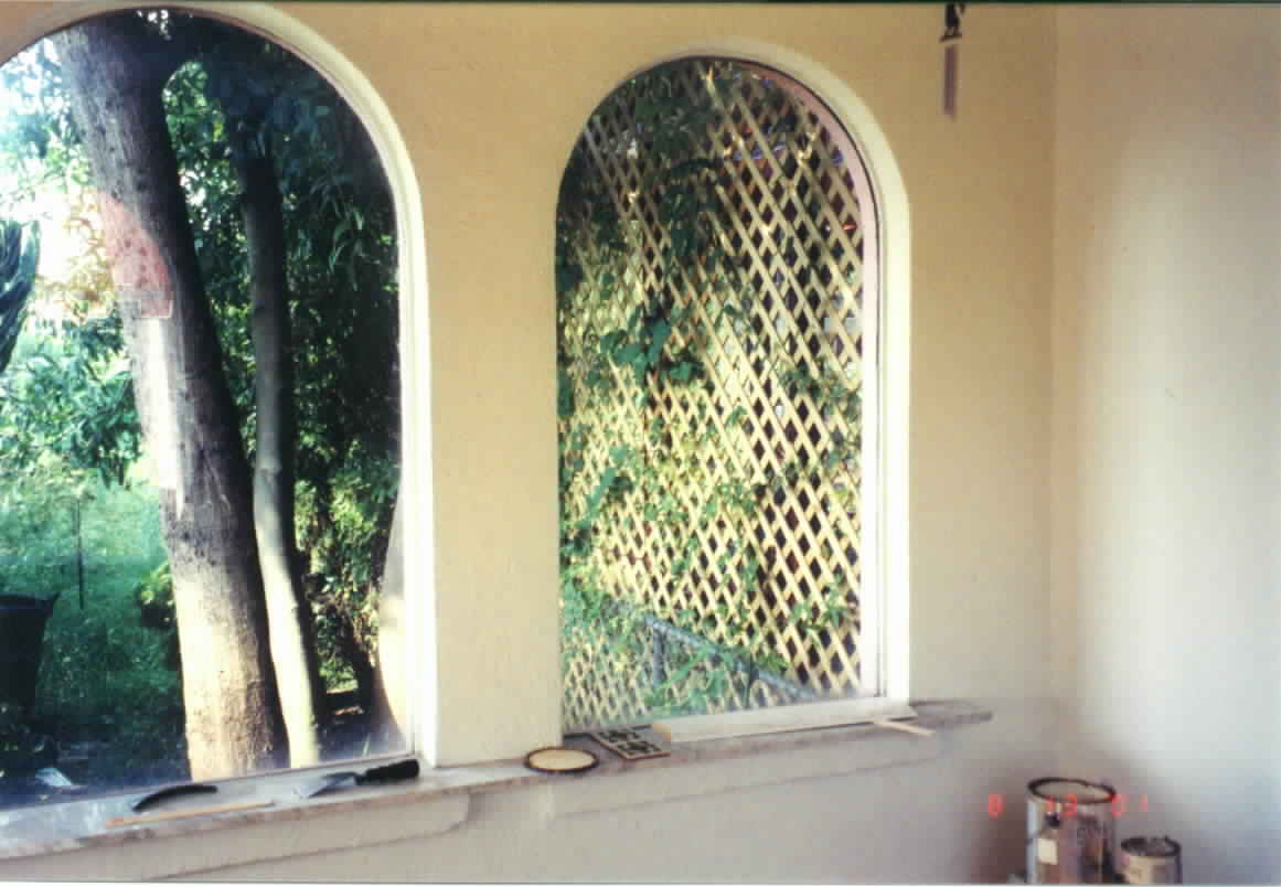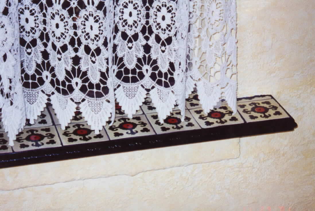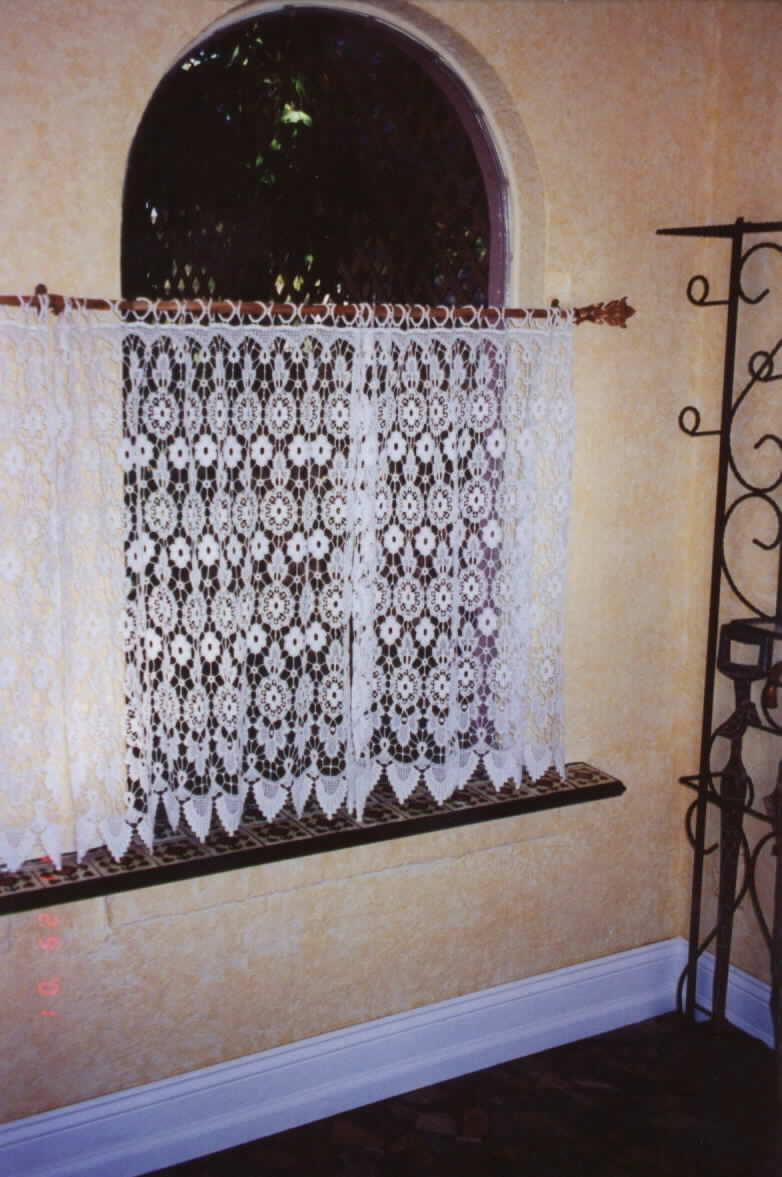 Directly below are the final results of faux wall painting, macrame-style curtains, new floor molding, and wall accessories. In addition, the marble sills were covered with handpainted Mexican tile and black grout to coordinate with other wrought iron accessories.