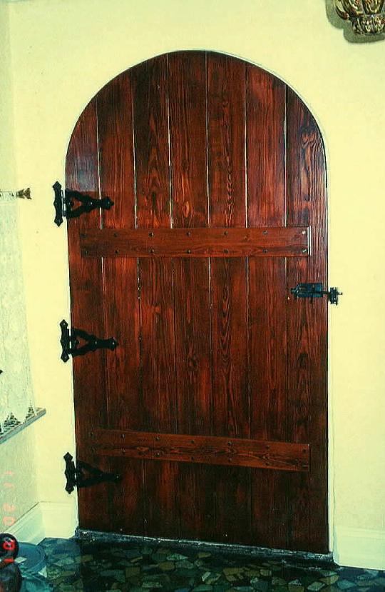 This is the hand-made entry door with heavy, wrought iron fittings. (When completed, this door weighed nearly 130 pounds!)