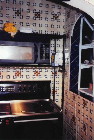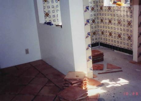 This is a photo of the above alcove during tiling. In addition to the Mexican wall tile, true Saltillo tiles were used on the floor. Pattern was a diagonal center area, with straight borders. Grout was later matched closely to the terra cotta of the tile. Note cobalt blue border on wall of cooking area to both highlight area as well as making cleaning easier. A shelf is to be added in the passthrough in the wall with 2 stools for visiting.